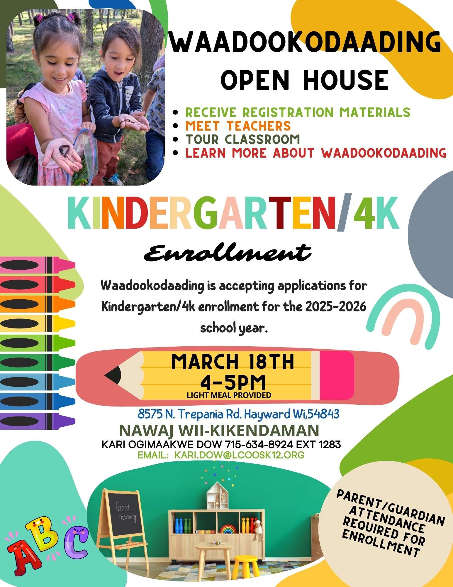 Thursday, August 14th, 2025 | 5:00 pm Location - 8575 N Trepania Road, Hayward, WI 54843 Waadookodaading Open House Receive registration materials Meet teachers Tour classroom Learn more about Waadookodaading Kindergarten / 4K Enrollment Waadookodaading is accepting applications for Kindergarten/4K enrollment for the 2025-2026 school year. Parent/Guardian attendance required for enrollment Contact Nawaj Wii-Kikendaman, Katie […]
