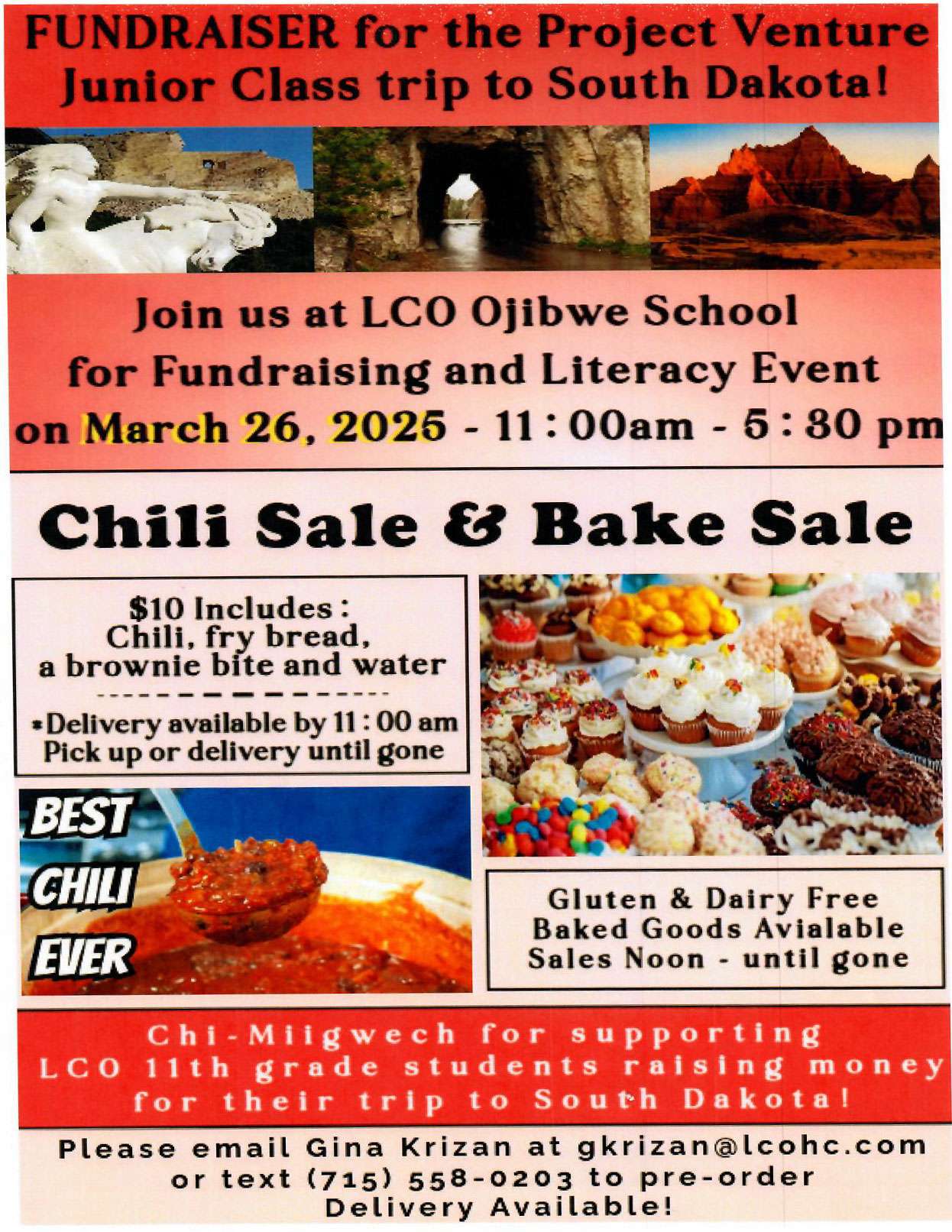 Fundraiser for the Project Venture Junior Class Trip to South Dakota! Wednesday, March 26, 2025 | 11:00am - 5:30pm $10 Includes: Chili, fry bread, brownie bite & water *Delivery available by 11:00am *Pickup or delivery until gone Email Gina Krizan at gkrizan@lcohc.com or text (715) 558-0203 to pre-order!