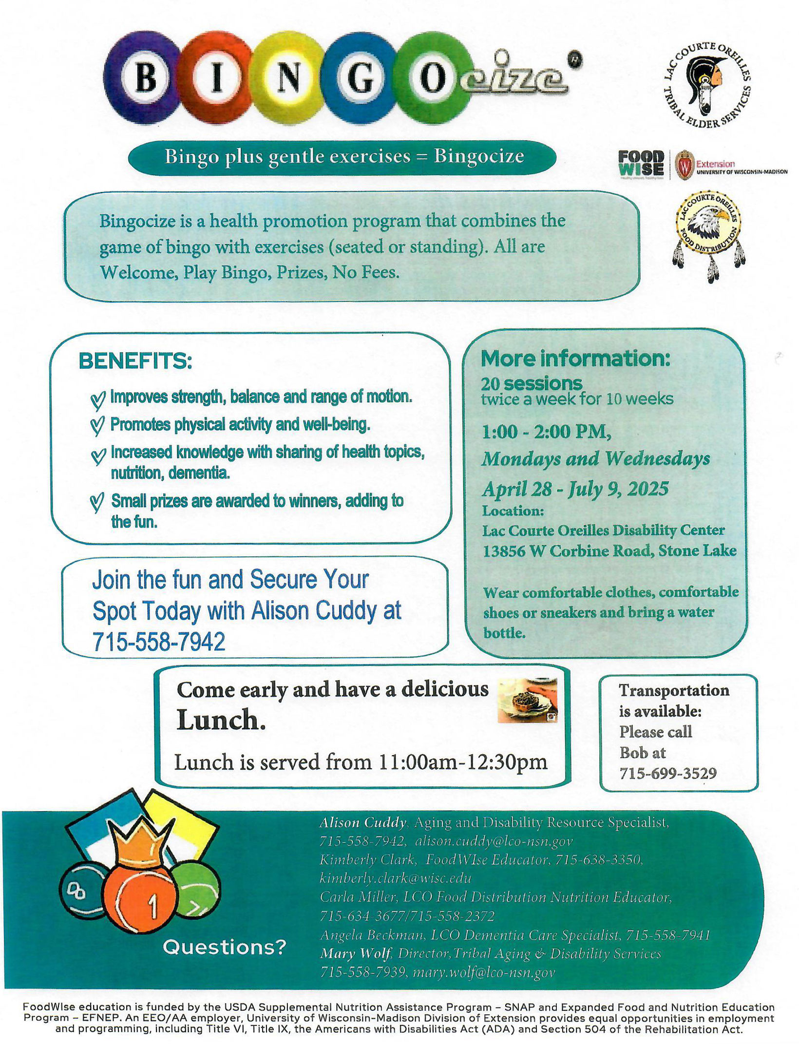 Mondays & Wednesdays | 1:00pm - 2:00pm Come early and have a delicious lunch - served from 11:00am - 12:30pm Location: LCO Disability Center, 13856 W Corbine Road, Stone Lake, WI 54843 Join the fun and secure your spot today with Alison Cuddy at 715-558-7942 Transportation is available: Please call Bob at 715-699-3529