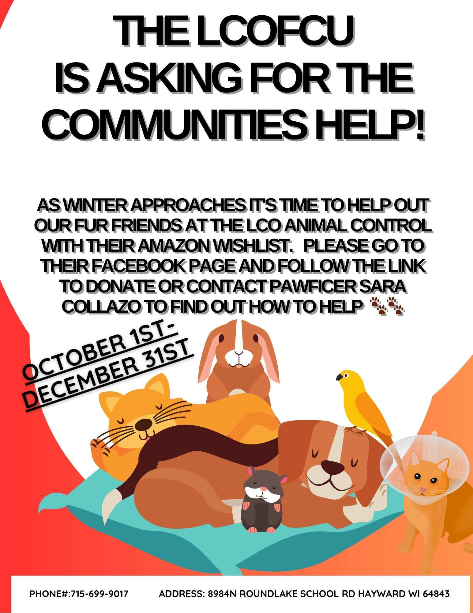 LCO Animal Control needs your help! Our shelves are running low on supplies, and with winter right around the corner, we could really use some extra support. If you would like to donate: Cash donations can be dropped off at the LCO Police Department Gift cards (Amazon or Walmart) are greatly appreciated You can also […]