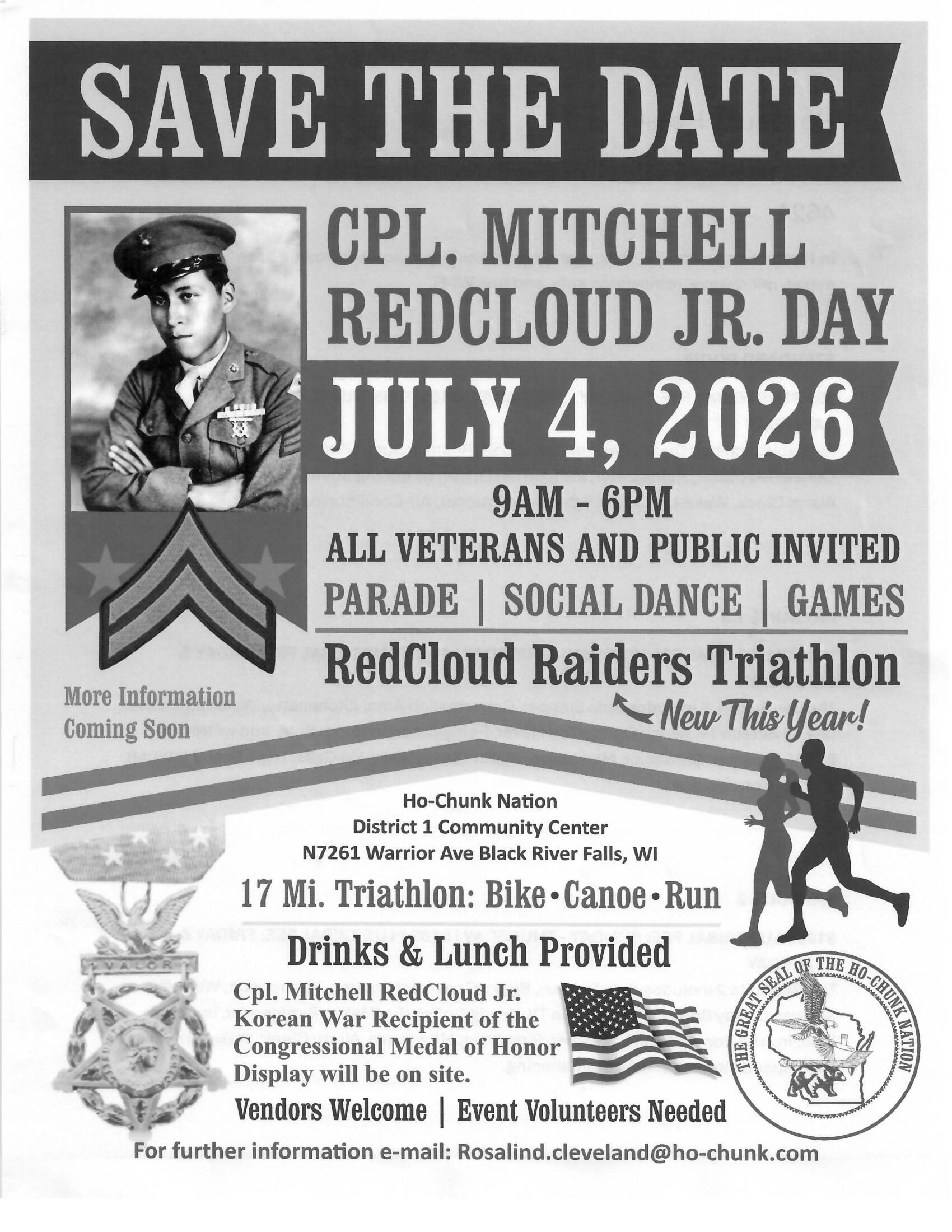 Saturday, July 4th, 2026 | 9 AM - 6 PM The Ho-Chunk Nation invites Veterans and the Public to participate in the CPL. MITCHELL REDCLOUD JR. DAY Celebration. For more information, please email rosalind.cleveland@ho-chunk.com See flyer for more information. |