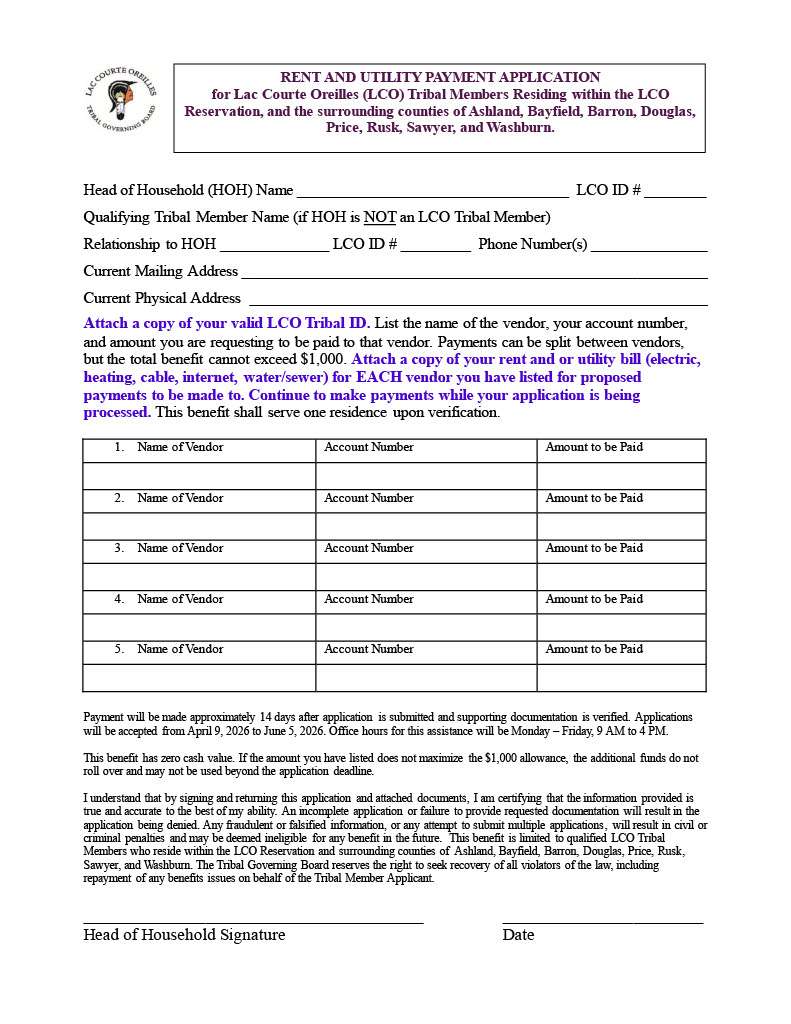 2026 Utility Assistance Payment Applications will be available beginning Thursday, April 9, 2026. Applications can be picked up and dropped off at the Tribal Administration Office Peter Larson Room. See […]