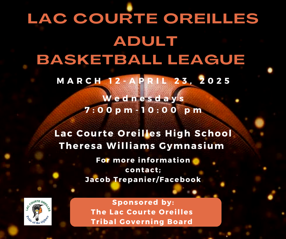 Home LCO Adult Basketball League WHEN: March 12 – April 23, 2025 | Wednesdays @ 7:00pm – 10:00pm WHERE: Lac Courte Oreilles High School Gymnasium WHO: Contact Jacob Trepanier for […]