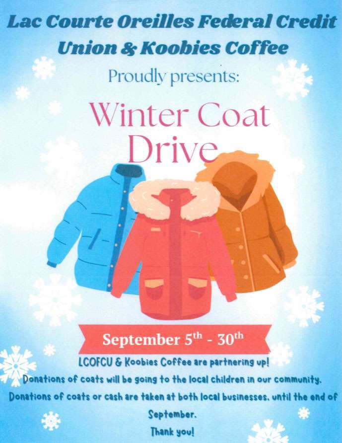 Donations of coats or cash are taken at the LCO Credit Union and Koobies Coffee until the end of September. All donations will be going to the local children in our community.