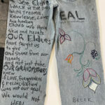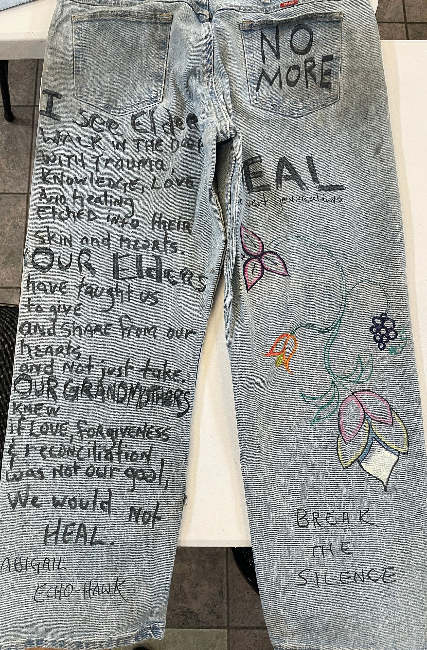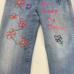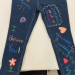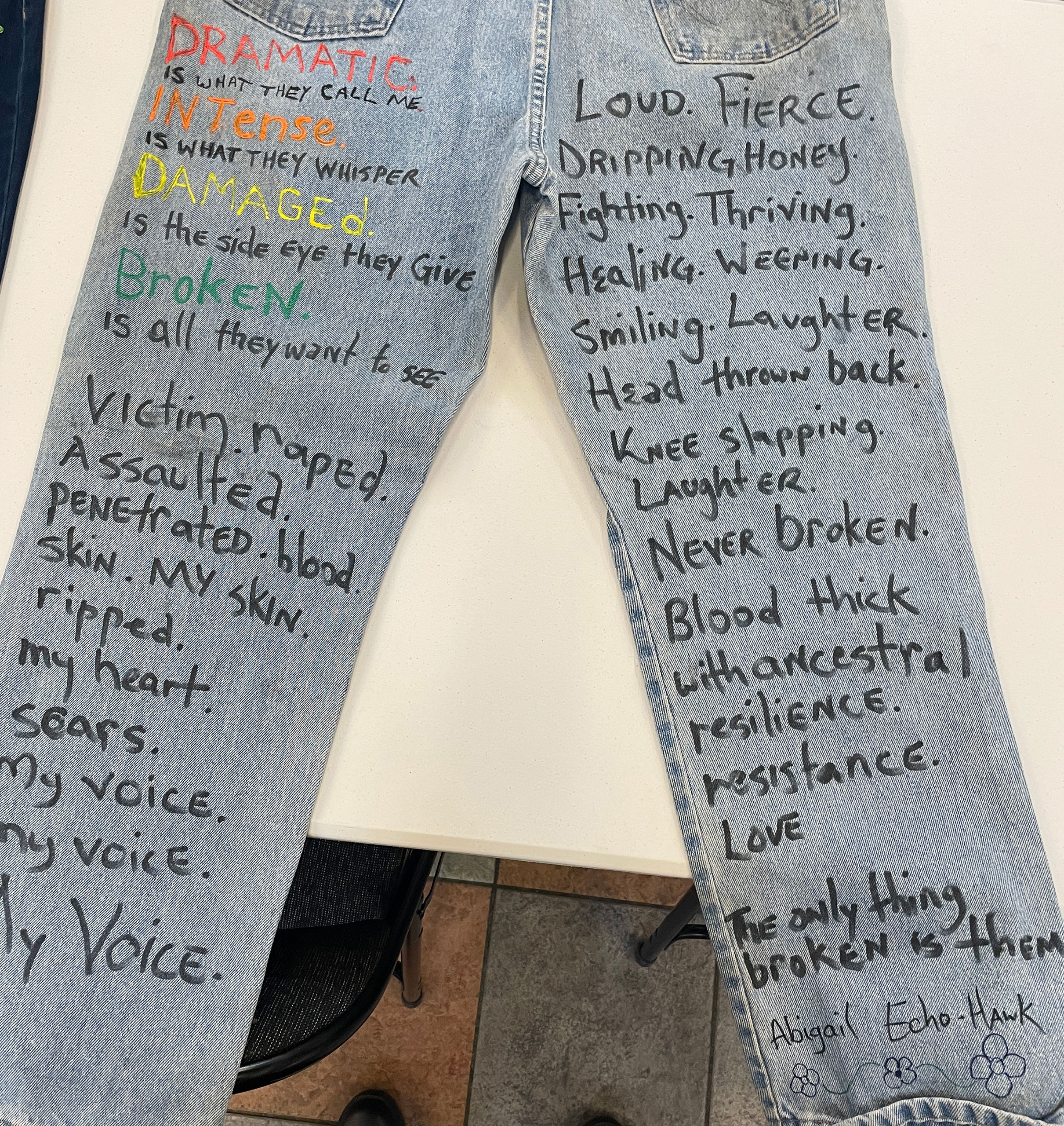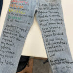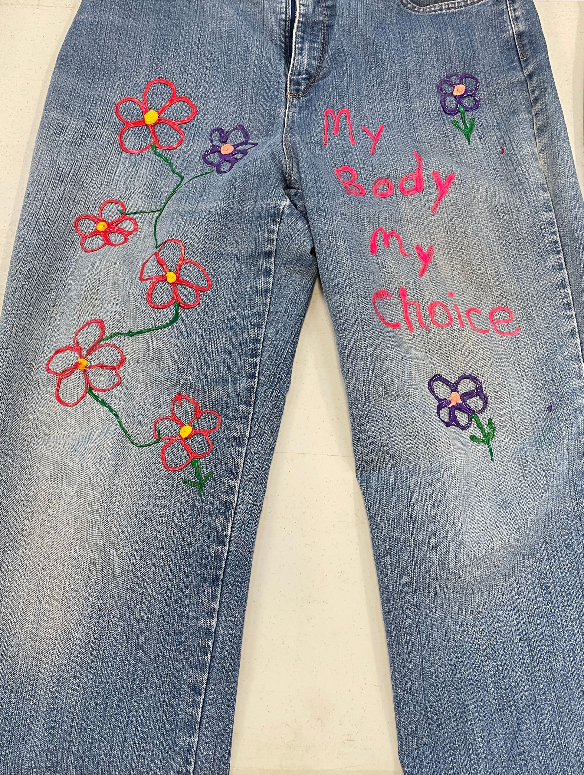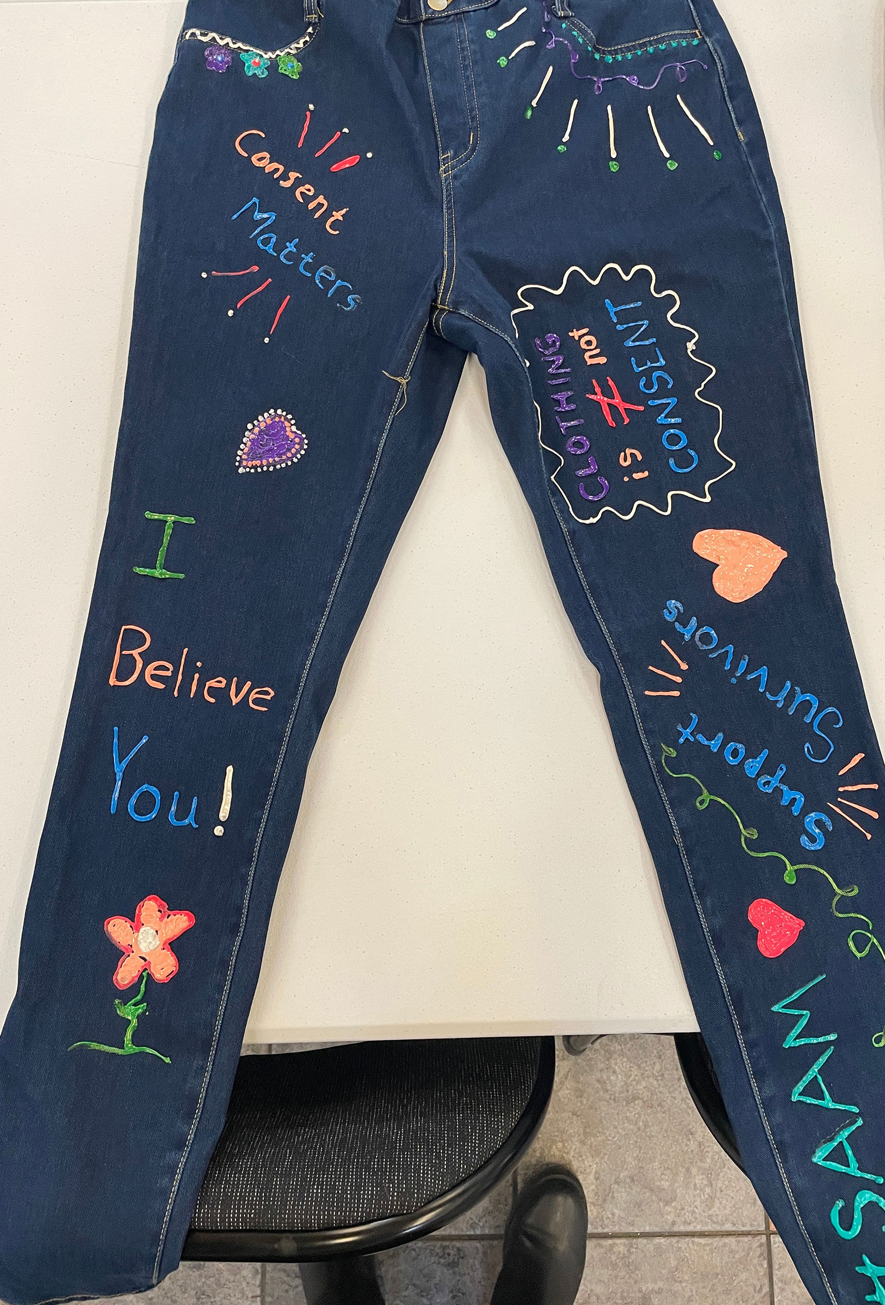 Community members were invited to decorate denim jeans in a collaborative art initiative, highlighting messages of solidarity, hope, and resistance to victim-blaming.