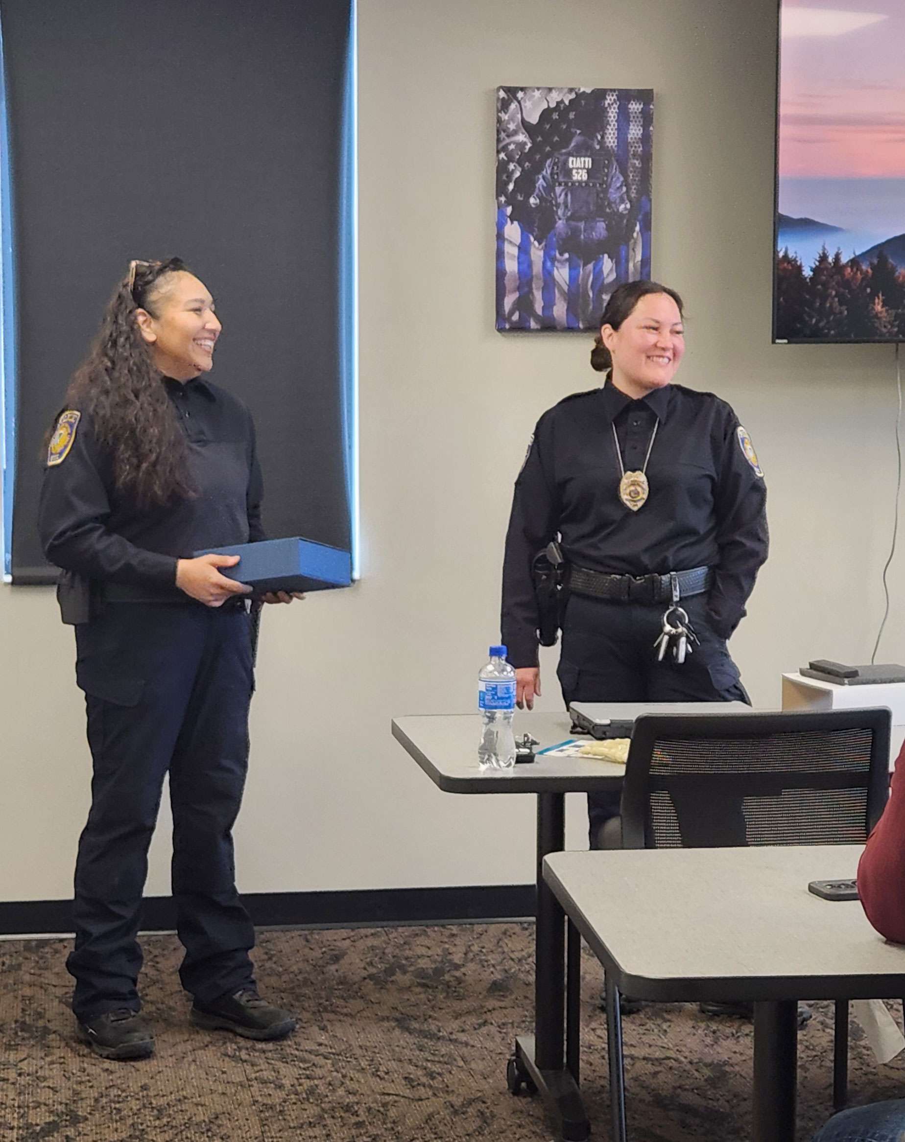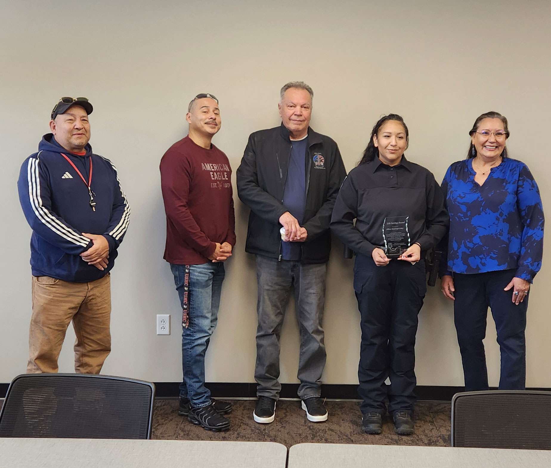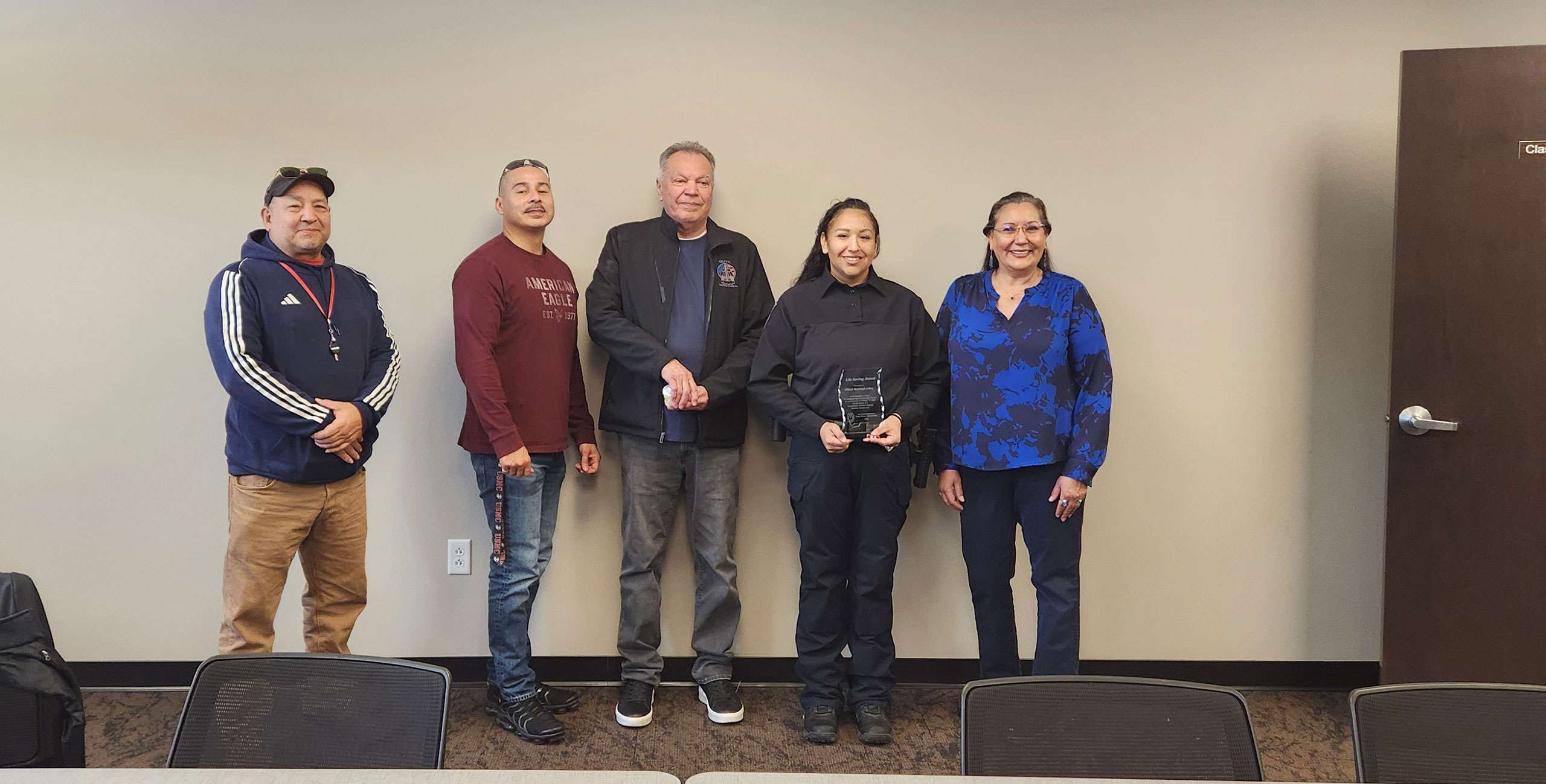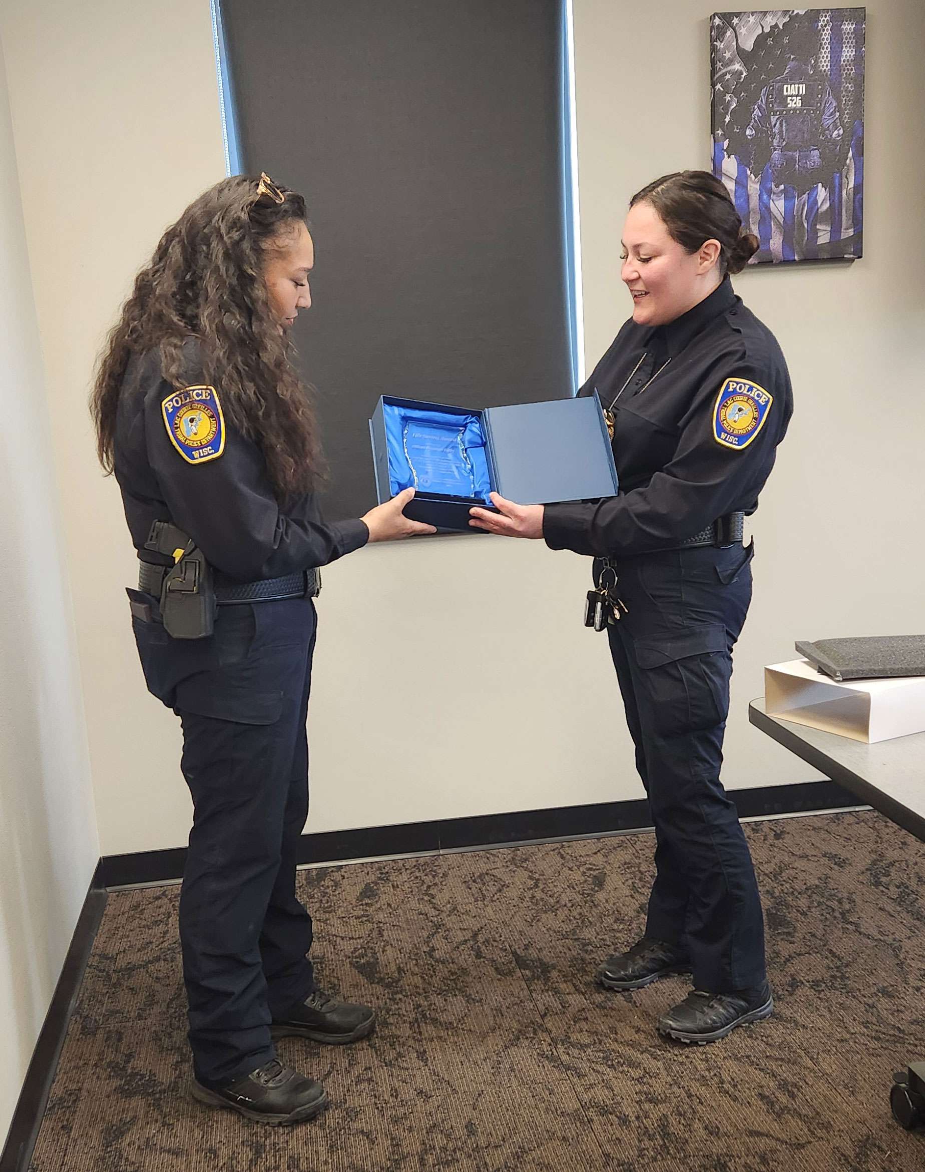 A crowd of family, friends, colleagues, and members of the Lac Courte Oreilles Tribal Governing Board gathered in the classroom of the Lac Courte Oreilles (LCO) Police Department to celebrate Officer Edley’s life-saving actions and recognize her outstanding service.