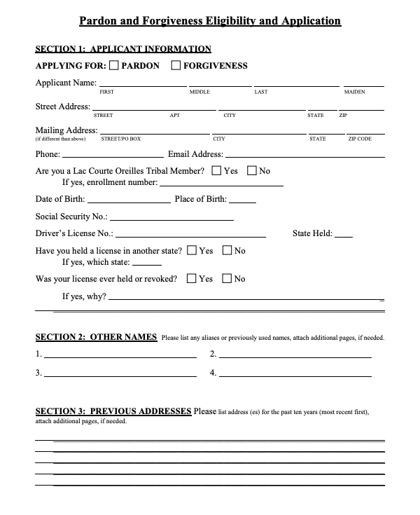 A Tribal member or non-tribal member may receive a pardon for any criminal conviction(s), or forgiveness for an act(s) that renders the individual ineligible for housing with the Tribe or other Tribal benefit(s); and any individual may receive forgiveness for an act(s) that renders the individual ineligible for Tribal employment, housing, an occupational license, certification, or permit issued by the Tribe; a foster care license issued by the Tribe; or others Tribal benefit.